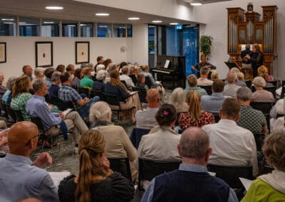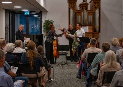Er moesten stoelen bijgeplaatst worden voor het eerste concert na de zomer, dat verzorgd werd door blokfluitiste Maaike Dessens, celliste Anne Knappstein en organist/pianist Arend Kettelarij. Uiteindelijk moest de deur naar de centrale hal open blijven om ook de laatste bezoekers nog een plekje te bieden. ’t Was een rijk gevarieerd programma, met muziek van Middeleeuwen tot onze eigen tijd.