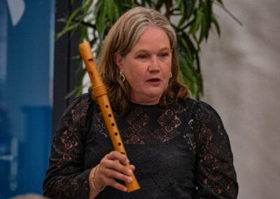 Maaike Dessens speelde op een renaissanceblokfluit een flitsende Estampie uit de 15e eeuw, waarbij ze zichzelf ook ritmisch begeleidde: heel knap! In een laatromantische klankenwereld nam Anne Knappstein de luisteraars mee naar Engeland, met een viertal “Studies in English Folksongs” van Vaughan Williams. Op de piano klonk onder meer muziek  uit de film “The Piano” (1993) en enkele muzikale portretten van bedreigde diersoorten van de Japanse componiste Karen Tanaka.